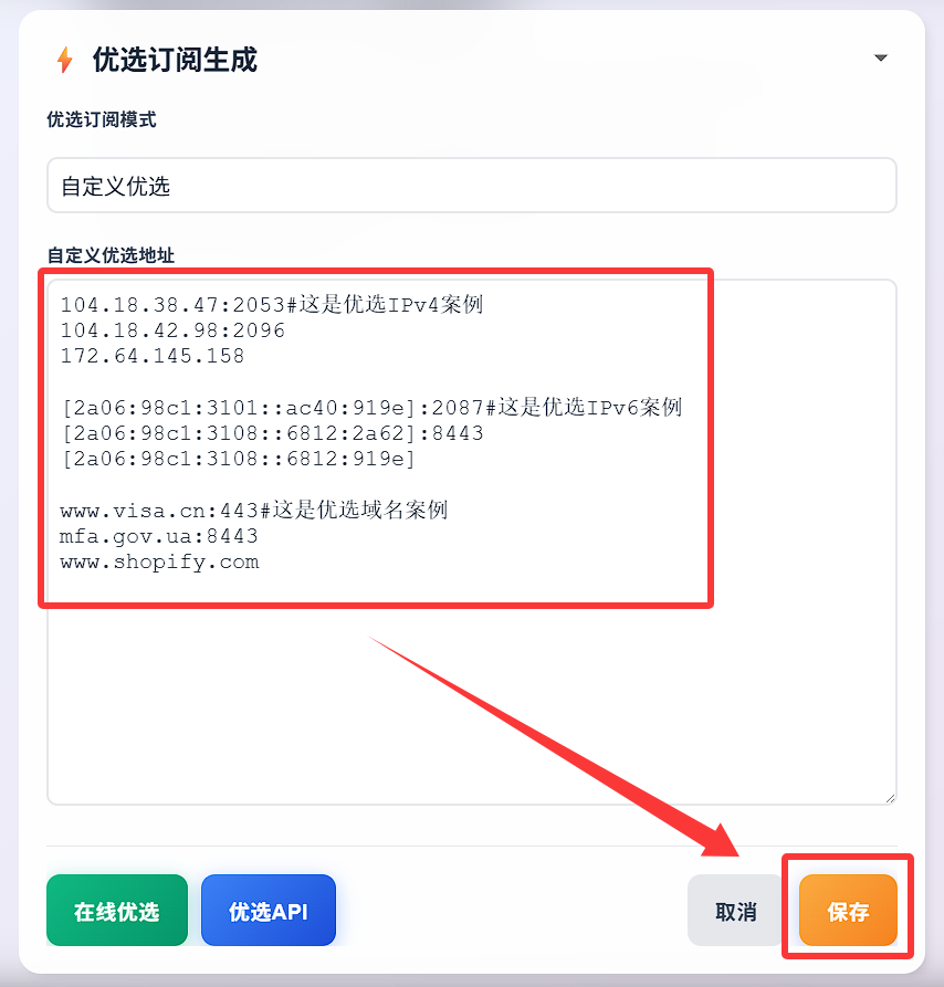 - 您可以手动添加你的优选域名IP,格式: